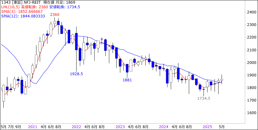 東証に上場している東証REIT指数連動型ETF(1343)の月足チャートをみると、2021年の最高値2,360円から長期下げトレンドになっていたが、昨年8月の安値1,752円、12月の安値1734円50銭、今年4月の安値1751円50銭というように1,734円台~1,752円で下値を固めて、いずれも月足は長い下ヒゲを引いていた。