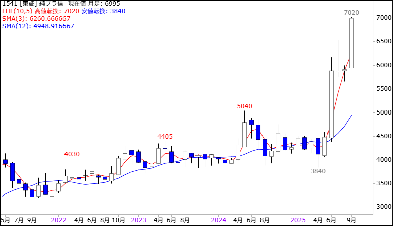 次の注目は金に対して出遅れ感が強まっているプラチナ(白金)だ。東証に上場している純プラチナETF(1541)は、今週7,020円まで値上がりして、7月18日の最高値6,533円を2ヵ月ぶりに抜いた。これで月足チャートでは7月の極めて長い上ヒゲをクリアして上ヒゲ全否定の強いチャートの形になった。
