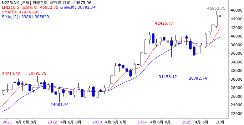 日経平均の月足チャートを見ると、4月の暴落の大底から9月までで6ヵ月連続陽線〇となった。戦後振り返ると4月から9月までの期間で月足が6ヵ月連続陽線〇というのは、1972年と79年の2回しか例がない。次の10月相場は72年が陽線〇だったが79年は陰線●だった。