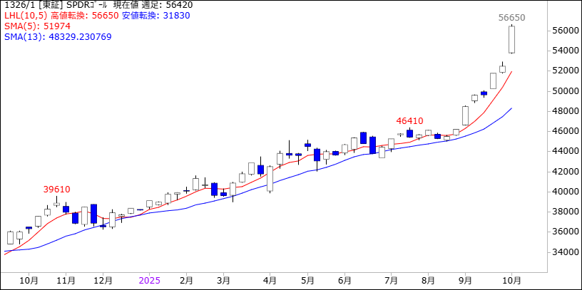 早見の週刊レポートでは、7月下旬に「臨時コラム」で東証に上場している金のETFであるSPDRゴールド(1326)を取り上げたが、その時の4万6120円から今週は5万6650円まで22.8%も値上がりしている。個別株と違い金相場でこれだけの値上りは非常に大きい。だが依然として天井打ちの気配が出ていない。