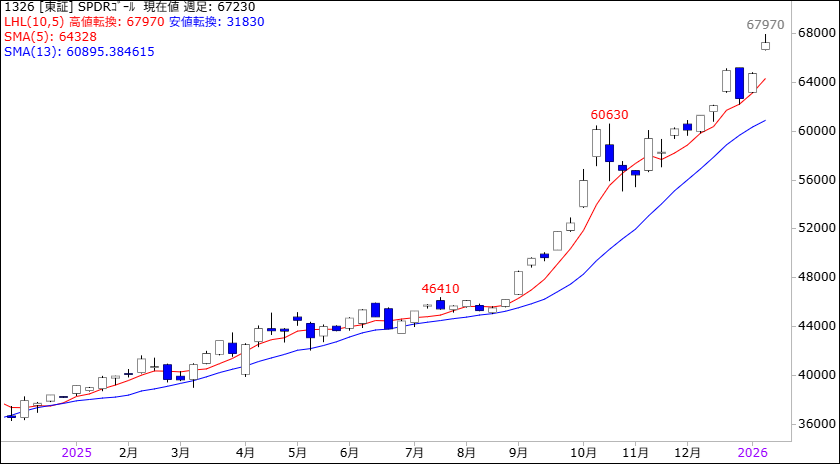 早見の週刊レポートで金相場の上昇に目を向けて、東証に上場している金のETFであるSPDRゴールド(1326)を当コーナーで取り上げたのが昨年7月22日の寄付き値4万6120円のところだった。