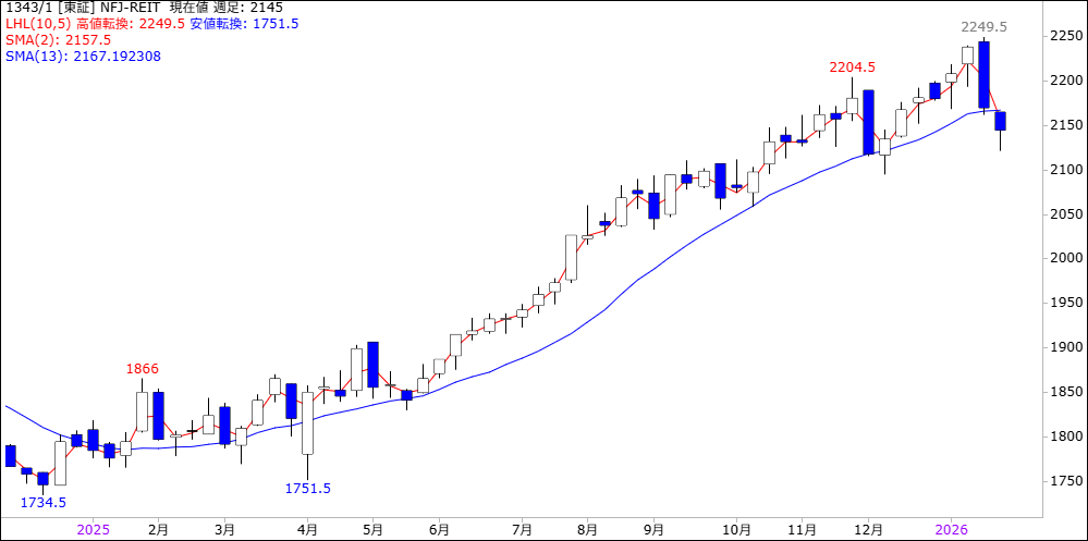 東証のREIT相場が、ついに大きな変調をきたした。東証に上場しているREIT指数連動型ETF(1343)の週足チャートを見ると、1月19日に2249円50銭の最高値から反転急落。週足チャートは最高値での陰線包み足になり、今週は2121円50銭まで一段と下げた。その時々の高値での週足陰線包み足は昨年5月や10月にも出現していたが、それらの時と違い今回は2週線と13週線が今週デッドクロスしてきた。