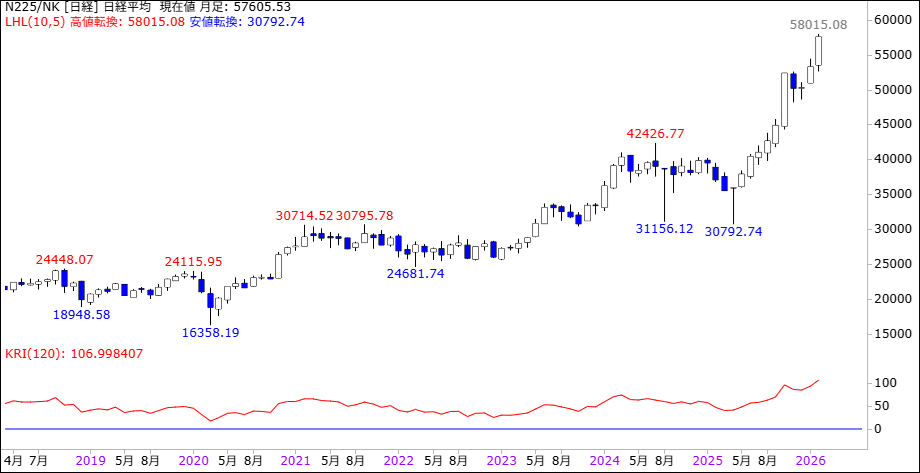 日経平均は今週上昇が加速して、5万8015円まで急上昇して、TOPIXと共に史上最高値を更新した。1月末の終値5万3332円からだと一気に約4,680円も値上がりしている。日経平均の月足チャートで逆張り指標の120ヵ月線とのカイリ率を見ると105%まで拡大している。これはリーマンショックの大底以降で最大の数値だ。
